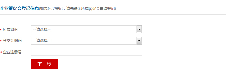 1.1 进入注册页面后,输入企业贸促会登记信息,填写无误后,点击下一步!(企业注册号由当地贸促会分配)