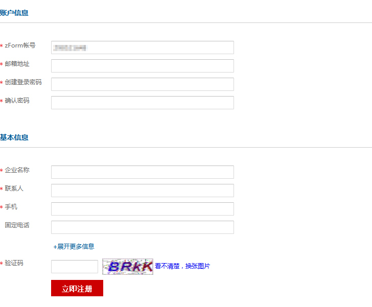 方式1: 在zForm(http://zf2.zform.net/)登陆界面点击 "注册",根据提示完成注册。