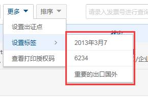 2、用户通过原产地证管理列表,选择1份或多份原产地证,通过功能操作区域的【更多】下拉选项,移入到【设置标签】,则系统会展开所有已存在标签选项,如图: